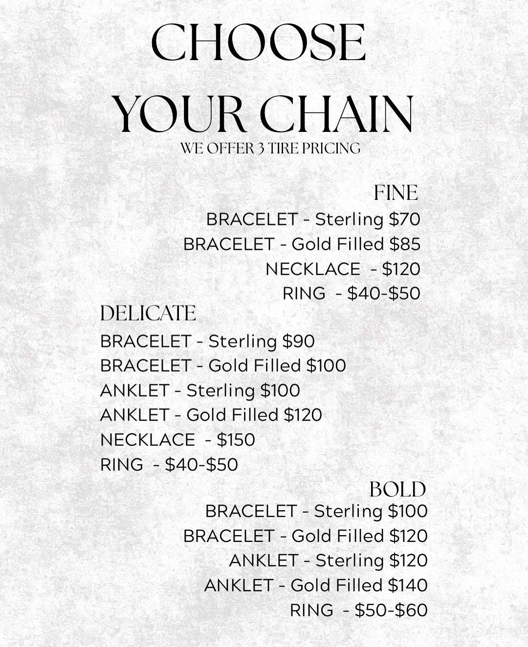 We offer a wide variety of chains for you to choose from. On the day of your appointment, simply select the chain you'd like to have applied. If you'd like to explore the different styles ahead of time, check out our Instagram, where you'll find plenty of photos showcasing our collection.
